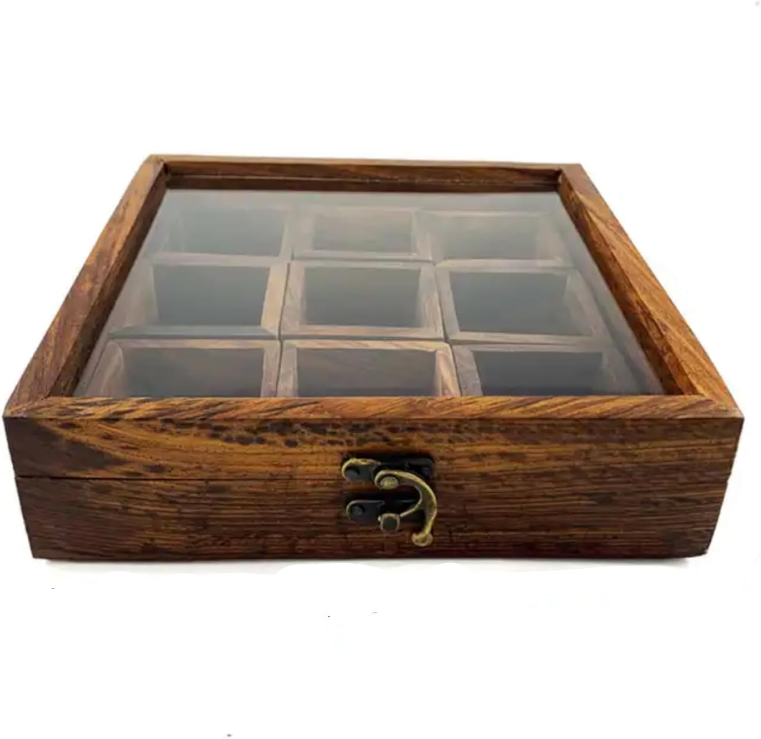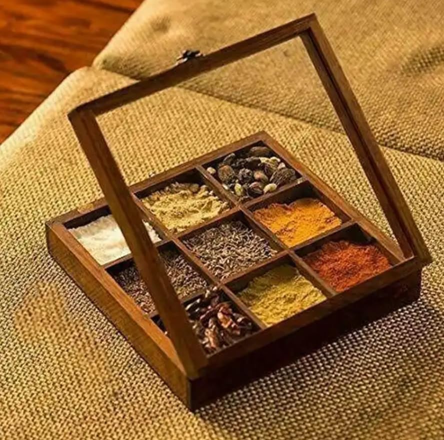 Wooden Spice Rack Box with Lid – 9 Compartment Masala Dabba 8x8 Inch