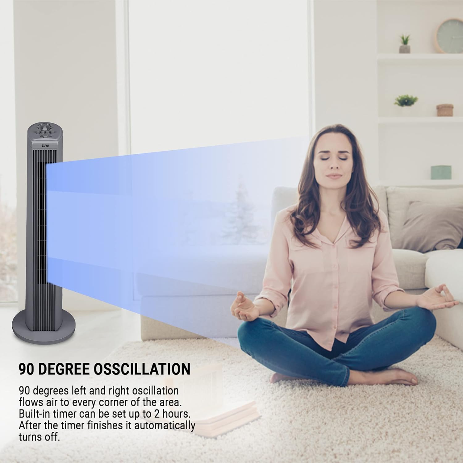 Introducing the Zuvo 30" Oscillating Tower Fan. This bladeless portable fan offers 3 speed settings and a 120-minute timer for customized cooling. Experience quiet and efficient operation, making it perfect for any home living room or office space. Say goodbye to bulky fans with this stylish and space-saving fan in Gray.